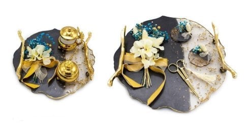 Siyah Epoksi Süslü Tırtıklı İkili Tepsi Seti